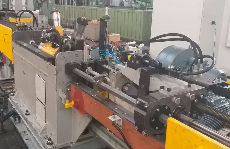 Механизм подачи и поворота трубы-заготовки(секция промежуточная). Служит для осуществления периодической подачи и поворота трубы-заготовки в зоне деформации. Включает патрон подачи, винт подачи, редуктор винта подачи, вал поворота, редуктор поворота, направляющую раму. Патрон подачи осуществляет зажим трубы-заготовки. Зажим выполняется клиновыми кулачками. С помощью передачи «винт-гайка» патрон перемещается по направляющим рамы. Гайка подачи закреплена на корпусе патрона. Винт вращается серводвигателем через редуктор винта подачи. Клиновые кулачки в патроне подачи установлены в шпинделе. Шпиндель получает вращение от шестигранного вала поворота, соединенного с редуктором поворота.